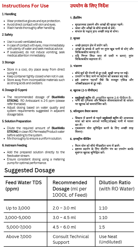 • The recommended dose of BlueWello Strong RO Antiscalnt is 2-5 ppm (please refer the table).